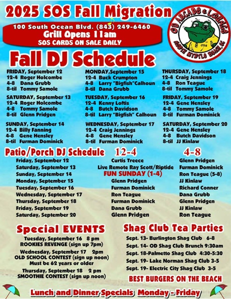 Located in the heart of North Myrtle Beach, S.C, The mecca of The Dance of the South, The Shag, The OD Arcade is a locals and visitors favorite hangout. Have a drink or dine inside or enjoy our outside cafe and watch the traffic on Ocean Blvd. Come in and enjoy the live bands, karaoke, shag dance events, the latest in state of the art games, billiards, our awesome dance floor, DJ lineup & more!